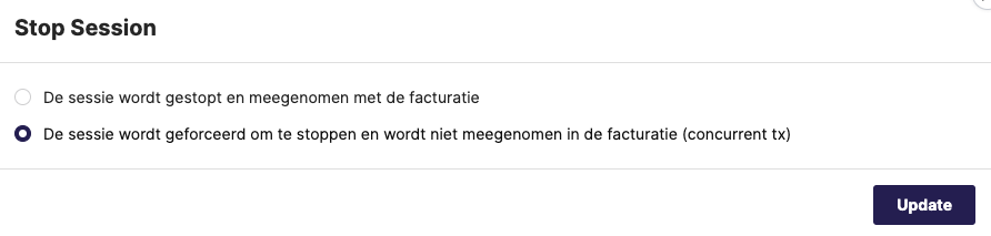 Dit betekend dat de laadpas nog een lopende sessie heeft op een andere laadpaal. Dit kan komen omdat de laadpaal offline was toen de sessie gestopt werd of omdat er een commando niet goed in aangekomen. Als dit gebeurt dan moet je het hidden ID van de laadpas (deze wordt zichtbaar in het veld van 'Authorize' kopieren. Ga vervolgens naar 'laders' en dan 'laadsessies' en plak daar het laadpas nummer. nu zie je alle laadsessies die met die pas op onze laadpalen zijn gemaakt. Als het goed is zie je daar ook een laadsessie die nog op 'charging' staat. Klik op 'meer' en dan op 'beƫindig deze actieve sessie' Selecteer vervolgens 'de sessie wordt geforceerd om te stoppen en wordt niet meegenomen in de facturatie (concurrent TX). en klik op update.
